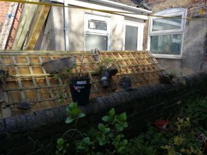 Each basket has many different plants crammed in them, then there are a series of smaller baskets with single species in them. There are individual pots balanced on the top of the wall and lots of them on the ground below. Planting up pots requires a balance of compost with crocks (broken pottery) in the bottom of the pots so they have drainage, but then I usually place a saucer or a bowl underneath to catch the water so that it doesn’t dry out. We have a hose pipe so we can water everything regularly.