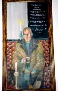 One of my murals from the Leopard Hotel in Burslem, Stoke-on-Trent, it burnt down a couple of years ago. Portrait of Walter a regular there.. Mural, emulsion on lining paper. I had to paint it a few feet up the wall, the paintings were painted within a frame attached directly to the wall. I just noticed his hands are too small!