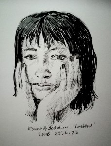 Tuesdays #bandofsketchers prompt was Content. I struggled with this, then looked up ‘content’ online. I found a lot of content faces. This is based on one of them. The drawing is done in fine black ink liner pen. I tried shading with it. Photo taken in quite a dark room so the brightness /contrast is a bit off.