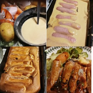 I followed BBC Good housekeeping magazines recipe for this. Vegetarians and vegans forgive me, you could use vegetarian sausages, but the batter needed eggs….