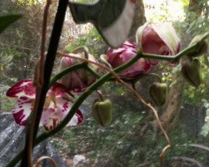 I didn’t notice but one of my orchids has flowered. Not a good photo, lots of camera shake. You can just see there are a few lower buds yet to open.