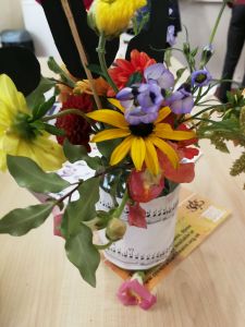 Flowers in a pot decorated with music. I went to the singathon at eccleshall yesterday and all the tables in the cafe had these lovely posies on them. You can’t see the black musical notes that were placed in the pots because I cropped the photo.