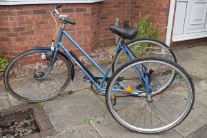 I need to move on. I’m not going to ride this and I’m not sure if anyone will buy it. It’s a trike conversion. The back wheels and stays are bolted onto a bike frame so it can be adjusted to different sizes. We refurbished it, adding new wheels in 2022. A friend has stored it for me for over a year but it’s not fair to expect him to keep it.