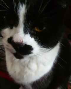 He got a bit of a scratch on his nose from somewhere. I’ve wiped it with some washing up liquid and salt water. He’s a big cat but gentle. He doesn’t fight much, just stays still and sometimes gets scratched. The look in his eyes is very loving. I think he’s a really sweet cat, but slightly bonkers! He purrs loudly at my other two cats and they all get on together. X