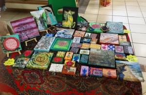 My stall was dwarfed by the other people’s. It’s only three or four feet across, and with everything lying flat my stall didn’t have as much ‘oomph’ as some of the others. I might try and get some stands for the paintings. I had some metal ones I’ve used before but they are too heavy and sharp.