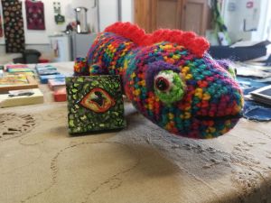 I painted a dragons eye on Saturday and found someone at the craft fair I was at on Sunday was crocheting karma Chamelions. Weirdly the eyes seem to match! How odd. I’m not sure why I bought the soft toy, it might go to a neice. I was so pleased I thought I’d take a photo of them together. X