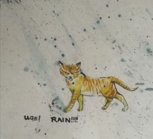 My Cat is black and white so when he comes in from the rain he often looks like an otter. He’s like that tonight but it’s too dark to get a decent photo so here’s a little illustration I did of a cat walking through the rain… He looks very fed up!
