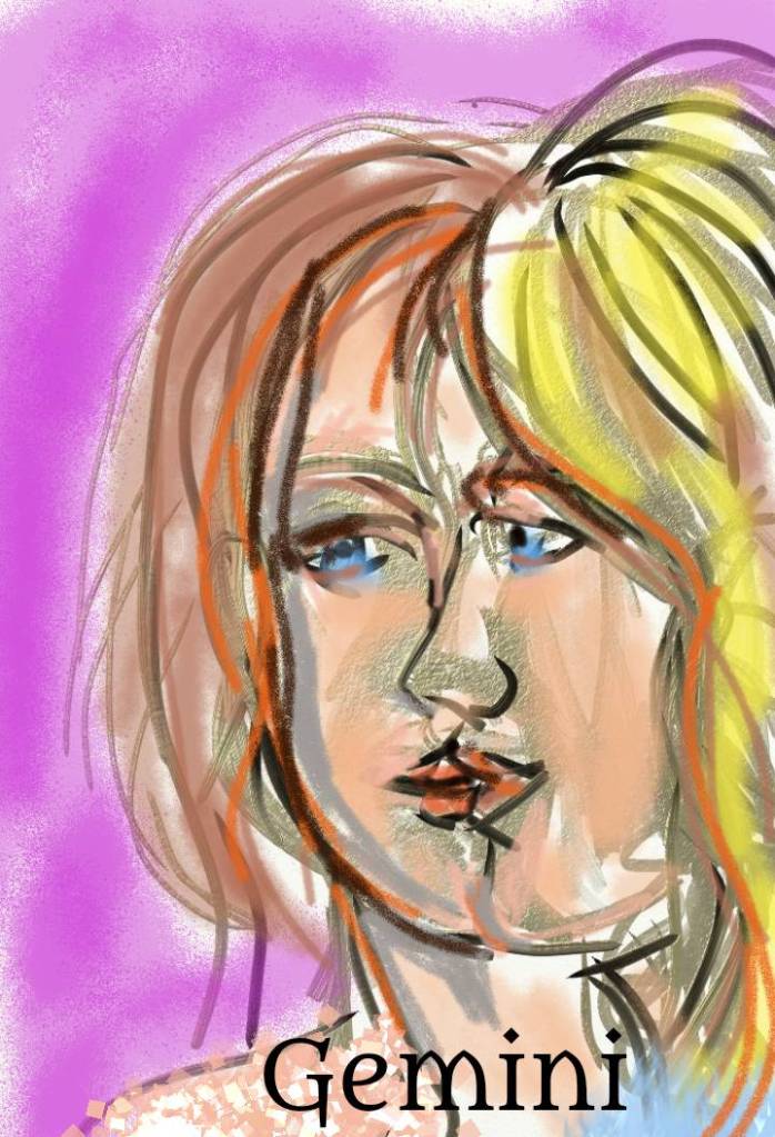 I’m into Astronomy not Astrology, but I do like the symbols that are used, I just tried this out as an idea to symbolise the Gemini ♊ twins. I wanted to capture the feeling of identical and non identical at the same time. I did consider different skin tones and eye colours. This is also female, but I could have drawn male instead. Drawn in ArtRage oils and Sketch apps, it is again an example of digital drawing. I might put it through a few filters and see what results.