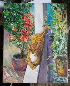 An imagined cat on a white wall. The plants make it feel like a courtyard. I had fun with the paint mixing different tones and colours . The cat is a ginger tabby staring out of the painting. Acrylic on canvas.