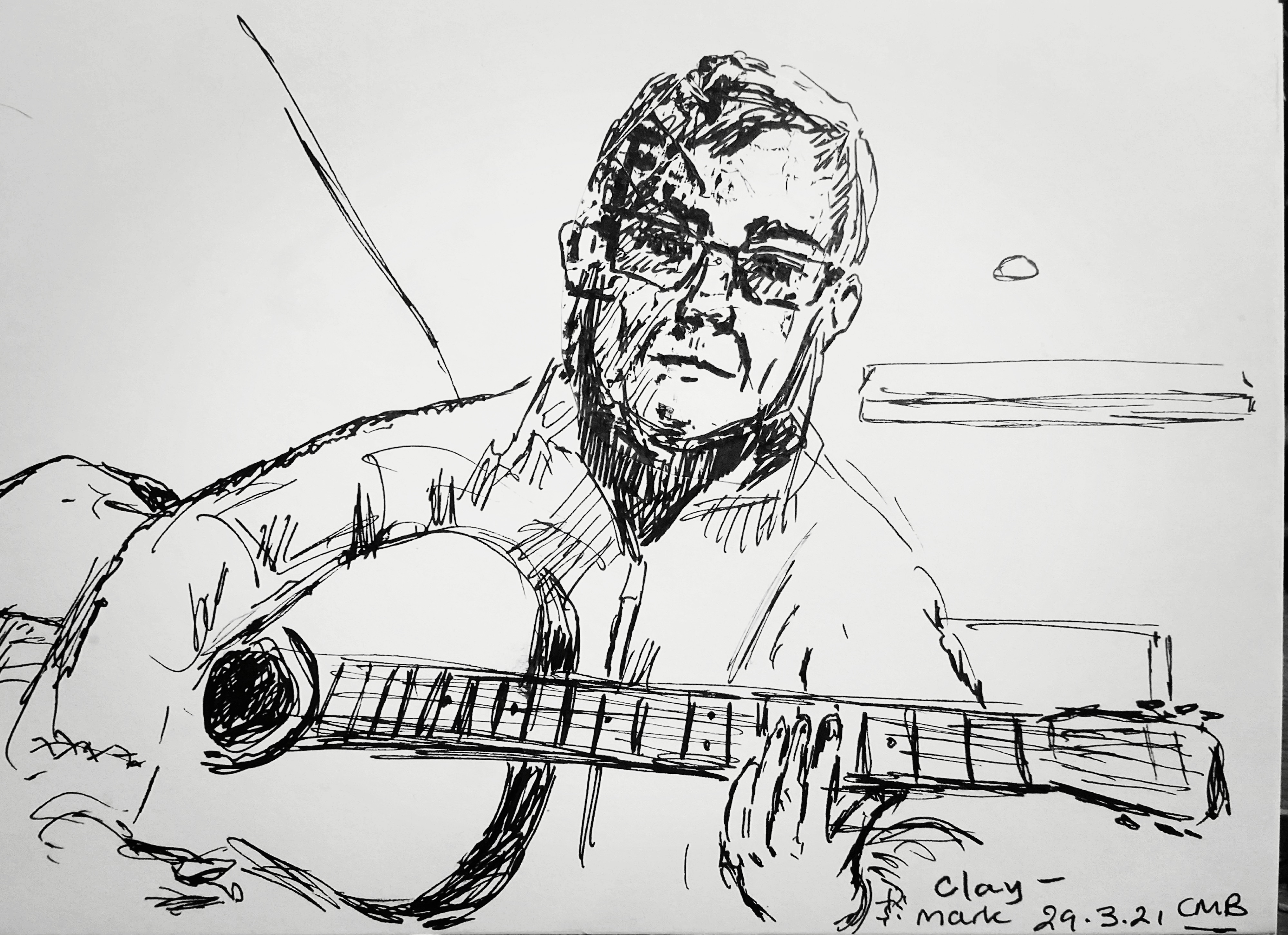 Mark who was part of this evenings Clay Chorus group. He played two brilliant songs. I used a bit of monoprint to add shadows to the side of his face. I only used a bit as he was moving and playing his guitar as I was trying to sketch him.
