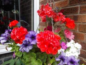 My birthday treat, hanging baskets up, some plants on the wall. I still need to empty some pots that have weeds in and do the rest of the wall and on the ground. Sometimes I will place pots on top of other pots that have soil in them so they get more light and the roots can grow down into the lower pot. Possible further plants I want are trailing lobelia, fushias, pelargoniums, nemesia, montbrecia, busy lizzies, sweet peas and oriental poppies.