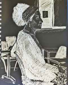 When you use filters it can create some quirky effects. It’s hard to tell which shape is a chair back or my coat (it was my coat on the back of a chair). Also it’s difficult to know how much shading to use. Will the result be delineated so you can tell where the models arm is? Should I have done less hatching? I think I used the negative space quite well. It’s always worth exploring ideas.