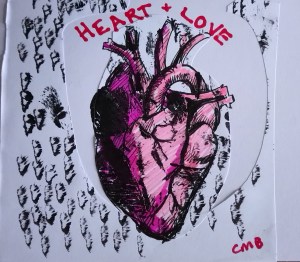 Hubby laughed! I used a red envelope with a white interior and then just used scissors to cut out the heart shape and I made a wide hinge/ flap so I could write all the way round the heart. I couldn’t get a good photo because the lighting casts shadows so it’s a bit twisted. There are quick sketches of a rose and a violet… Anyway it was quick and effective.