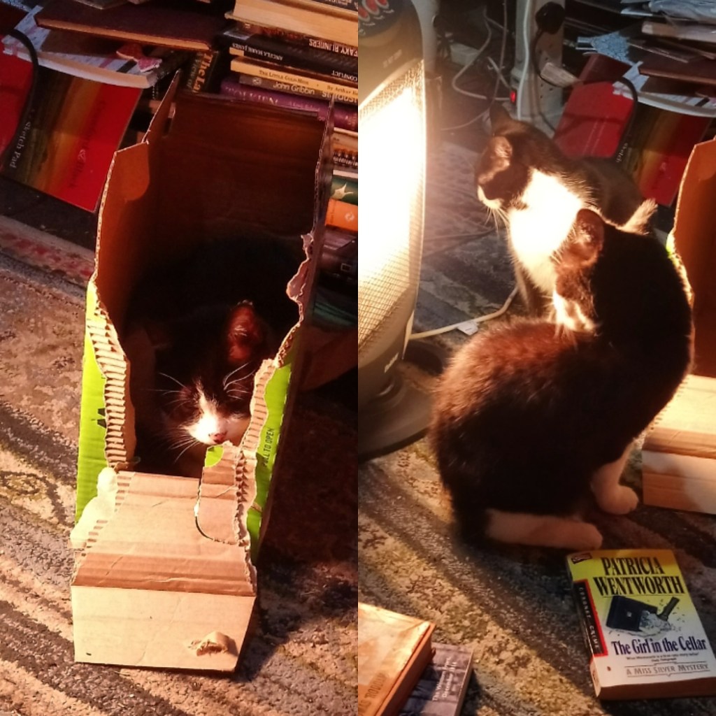 They are both by the oil heater. Remarkable as they usually chase each other. The third is beside me curled up on the chair. Now ones moved, I have a little igloo bed she gets in to keep away the chill. I think I need one of those sausages that you use at the base of the door to stop drafts. My door is right onto the pavement with no porch, so any drafts sneak in. My ankles are permanently cold at this time of year. Anyway at least the cats are warm. X