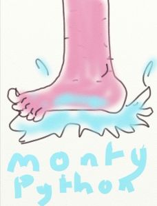 It’s cast, Terry Jones, Terry Gilliam, Eric Idle, Michael Palin, John Cleese and Graham Chapman, together with other actors and comedians created an anarchic, silly and surreal brand of humour, consisting of a series of  sketches, often with a running joke threaded through them. Often the sketch would peter out and a cartoon foot would come down from a precenium arch and squash the characters. That is what my illustration is about.