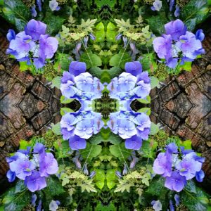 Hydrangea duplicated, green faces seem to emerge from the background of bricks. Pareidolia at large.