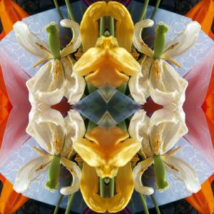 Almost withered, the tulips still have sculptural interest to me. By using the symmetry of four pictures I created interesting patterns including this one. By rotating the images you are able to make different patterns including thus one. I hope you like it. I used my incollage app to work on it and create a kaleidiscopic effect. .