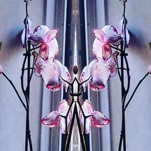 This morning I saw the sun shining through the petals of my orchid flowers. I have four plants and they flower for ages, but this is the only one in flower at the moment. I decided to mirror it to create a more abstract, alien image, perhaps a real alien! I adjusted the colour to a more blue grey tone. It was very yellow because of the morning sunlight.