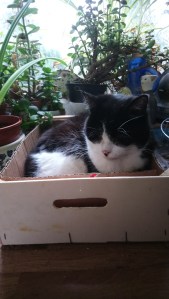 Houseplants and the cat sitting in a box. He looks so comfortable. He sits here in the afternoon when the sun comes in through the window. It’s a lovely sight. Now that the weather is improving he goes and lies in the neighbours garden in the grass which is about a foot high. He comes in when the sun starts to set behind the high privet hedge. I think I would like to be a cat, no responsibility, food at regular intervals. Care and attention. I love this little cat.
