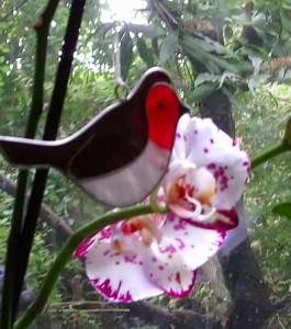 Wonderful to see new flowers on one of my orchid plants. They are behind this glass Robin. I didn’t want to try and move it out of the way incase I knocked one of the flowers off. They are a bit brown on the edges, I think the orchid had dried out a bit so I need to get a mist spray for them. My other orchid plants are green but not flowering. I think they need new growing medium and to let their ariel roots get some freedom.
