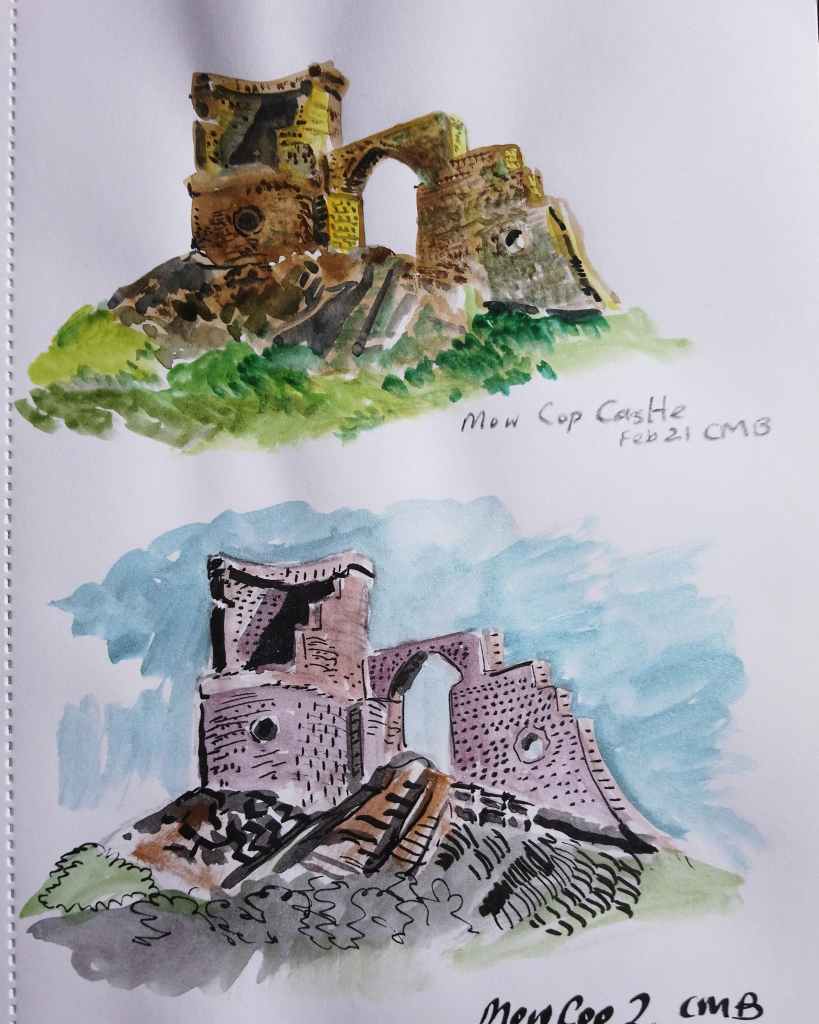 Experiment with paint and ink. The first painting was from a photo, the second one was extrapolated from the first. Both college work. Its fun trying different mark making and adjusting colours and hues to create different atmospheres in a piece of art. Mow Cop is a folly (pretend castle) sitting on a hill overlooking Cheshire and Staffordshire