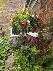Internet fixed so thought I’d post a picture of the back yard. Thanks to my sister for collecting the baskets and hanging them for me. I have filled a few pots for the wall but the understory on the ground is overgrown with perennial geraniums and Welsh poppies. I’m trying to build up a bit of colour. I have a mad variegated hosta and some lilies that hubby planted last year. Memory is a funny thing.