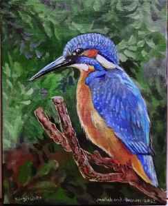 Kingfisher painting that was up for sale at Etruria Industrial museum today. Please to say a friend bought it. What a nice surprise and I know it’s going to a good home. Kingfisher feathers look blue but are actually brown. It’s the irridecence of their feathers that makes the colour glow.