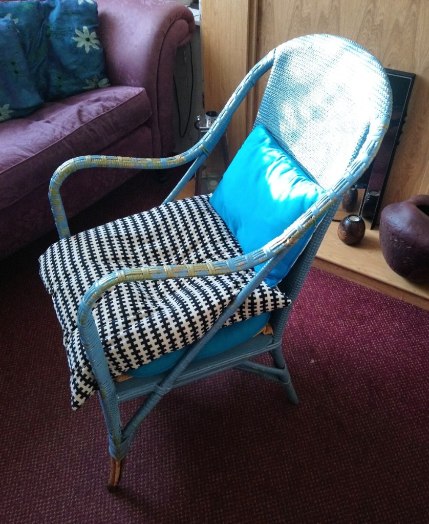 My friends blue chair, its so comfortable. I had one like this, but mine had woodworm. I treated it then wondered what to do. One of the legs was worst effected so I got two thick metal knitting needles and pushed them up into the leg where it had broken. Then I got some electric flex and wound it up and down the leg until I had covered the missing section. The cable fitted in quite well with the woven split cane that covered the rest of it. A second treatment of woodworm killer, then I painted it bright red. Like my friends chair it was extremely comfortable. That Christmas I was short of money so I gave it my sister who had recently moved out of home. As far as I know she still has it thirty years later.