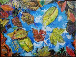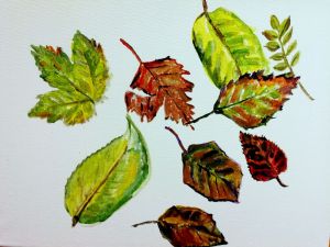 I started by picking up some leaves and tried to paint them and get the colours right. It then got left while I was not feeling well so I decided to try and do more work on it. I think I’ve not done too badly. The leaves are now floating in a puddle reflecting a blue and white sky. Should I do more to it?