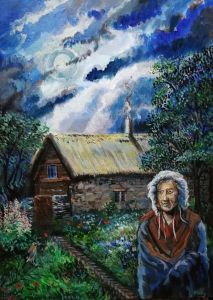 My painting shows her old cottage and medicinal plants such as foxgloves. It’s a moonlit night and I painted a ring of icy cloud around the moon to make it more spooky. The ancient woman depicted is actually based on a French peasant woman by Theodore Gericault.