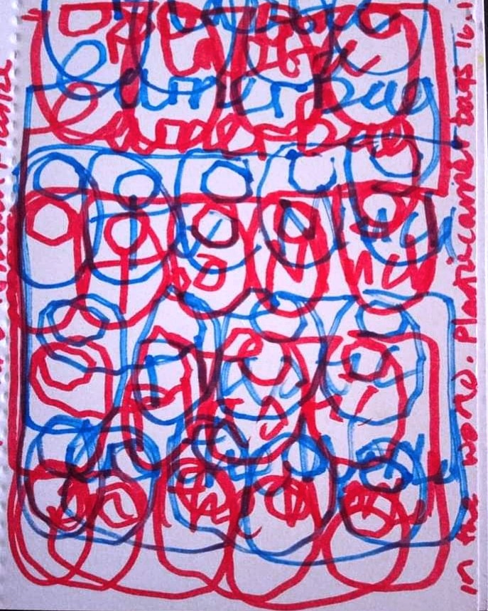 Two drawings prompted by a friend who is interested in more abstract work. The first is a repeated line drawing of carrier bags using two pens held together. Then I wrote over the top, plastic carrier bags, too much plastic in the world. The second is meant to represent folded paper. I could also have tried using masking tape but I don’t have any. So I drew on limited colours and varied the thickness and weight of the lines. Digital drawing.