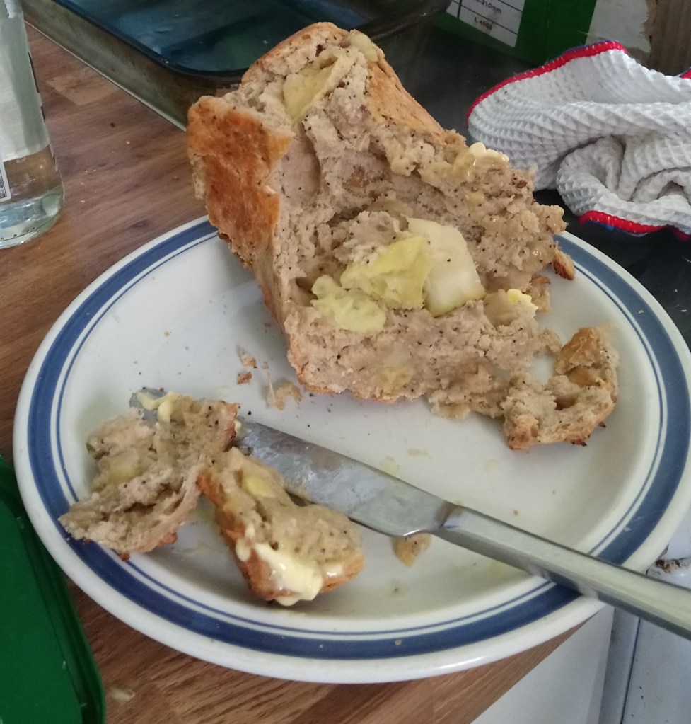 Bread (with oats, rye, multiseed loaf mix and tiny bits of pasta!) I think he would have added the kitchen sink. He did add larde chunks of apple and also pear. Had a bit hot with some butter. Well cooked, moist, not too crusty! I’m amazed!