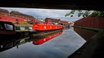 View of a bright pillar box red boat. Longport Wharf, Longport, Stoke-on-Trent. We were walking down the canal to get back to our car and I glimpsed this bright red boat beyond a bridge over the canal.