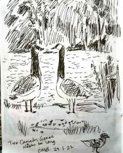 Sketch of two Canada geese at Westport Lake today. I know their necks are too long. We went for a short walk but the wind was quite cold. So I decided to sit down and draw some of the birds and a view of the rippling water on the lake. While we were there a young man went up to one of the fishing platforms on the lake and started dipping his feet in. He was acting very strangely so we watched incase we needed to ring for an ambulance. But he came over to us and asked us if we wanted to buy a camera? Very strange. So I finished the sketch and we left. I hope he was OK but it was hard to know what to do.