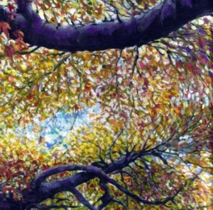 When you stand under a tree remember to look up. You might be surprised to see the pattern the branches make and how the leaves don’t always overlap so they can absorb as much light as possible. Spreading out towards the light (phototropism) is where plants bent their stems to move towards the light. Look at the different shaped trees make, depending on the species. Some even have nicknames. Ash trees are supposed to have branches like witches fingers. This was one of my paintings from about twenty years ago.