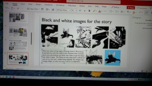 One of my portfolio pages on screen. I was pleased by some of the comments about my book. Juxtaposing black and white images against coloured abstract ‘scales’ drawings. I’m not keen on PowerPoint but it’s better than Word for trying to position images. In Word the pages skip about and then you find your picture on one page and the title or the description on another. Now all I need to do is think about getting the book published if I can.
