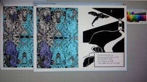 I’m not going to share my whole story, but I thought I would show you a couple of pages of my Swimming Dragon book now I’ve passed my MA in illustration. I wanted to do a children’s book with the story pages looking like black and white lino cut prints and the opposite pages in full colour patterns that could represent dragon scales or other ideas. The idea was to give children a look at abstract, complex art and pattern, together with an adventurous storyline that would lead them through the book. I want to try and get a spark of creativity released through the book. I hope this makes sense. I hope I can work out a way of publishing it.