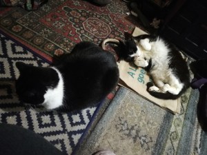The cats asleep on the mat. No space to walk past them and I want to get in the kitchen to make a cup of coffee. Meanwhile the wind is whistling round the windows and the cat flap is rattling in the wind.
