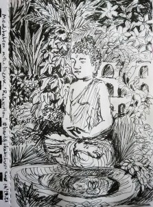 Today’s #bandofsketchers prompt was relaxation. Meditation on Relaxation, a Buddha in a garden. I looked at our Buddha outside but I made the plants and the pool up because our garden isn’t very exotic. Fine black ink liner pen.
