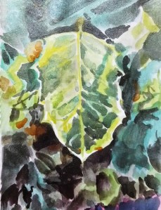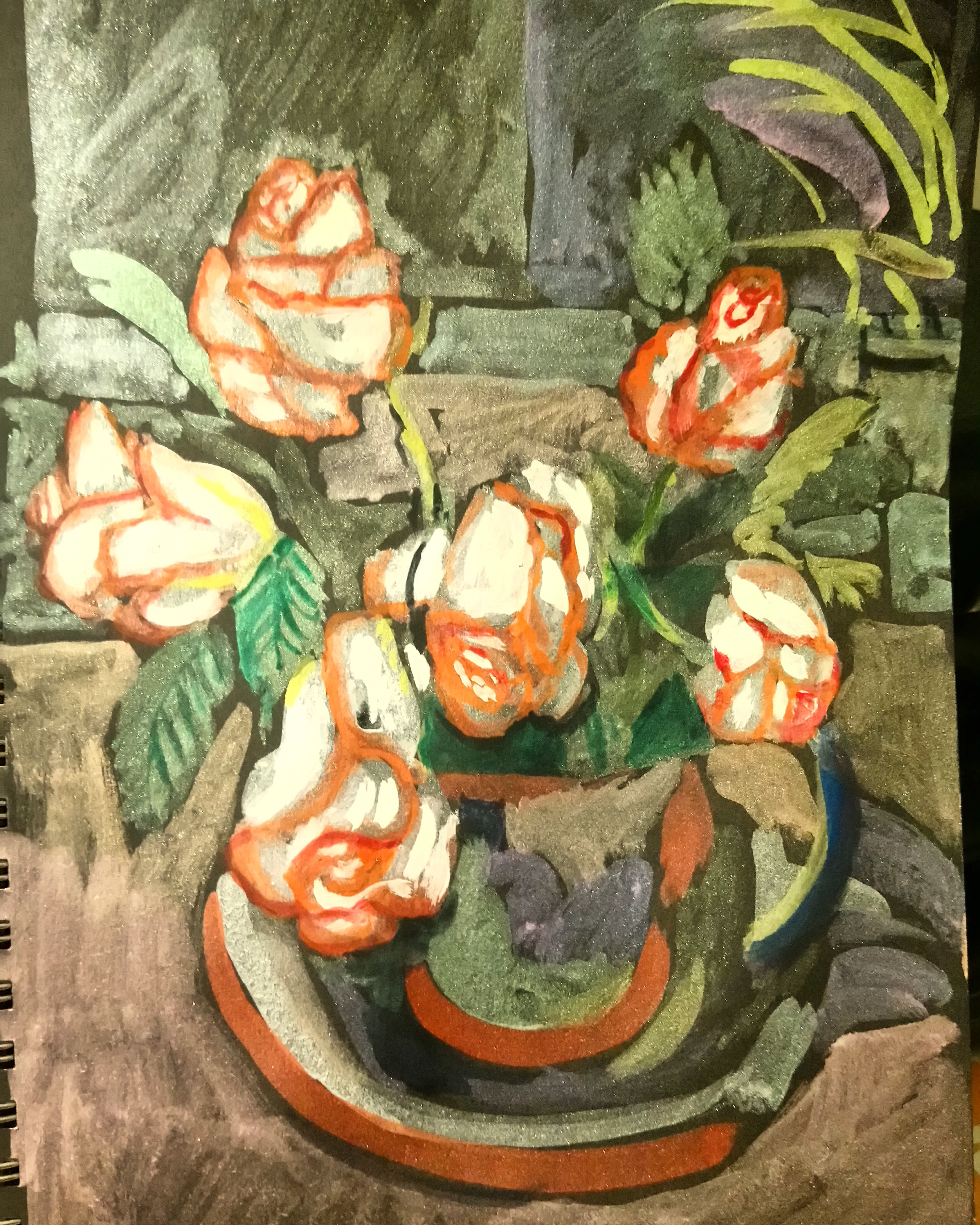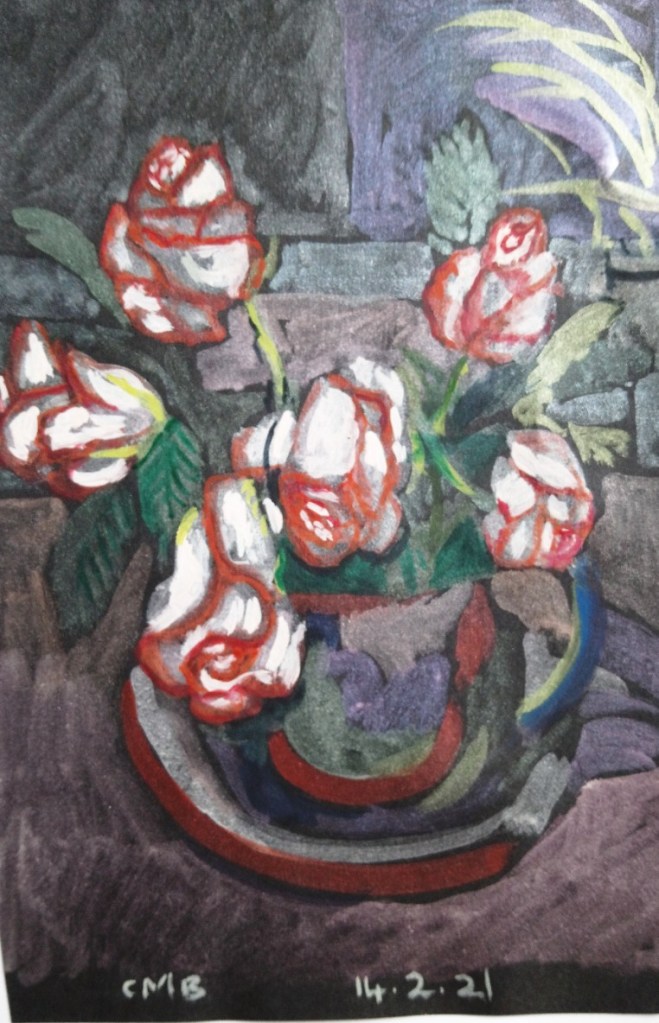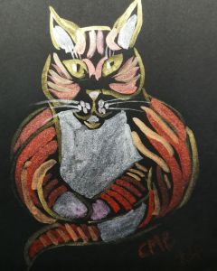 Someone bought some metallic paints in to an art group I go to. I could have painted flowers but I did a ginger cat instead. I enjoyed using curving brush strokes. It only took a few minutes to paint but it cheered me up.