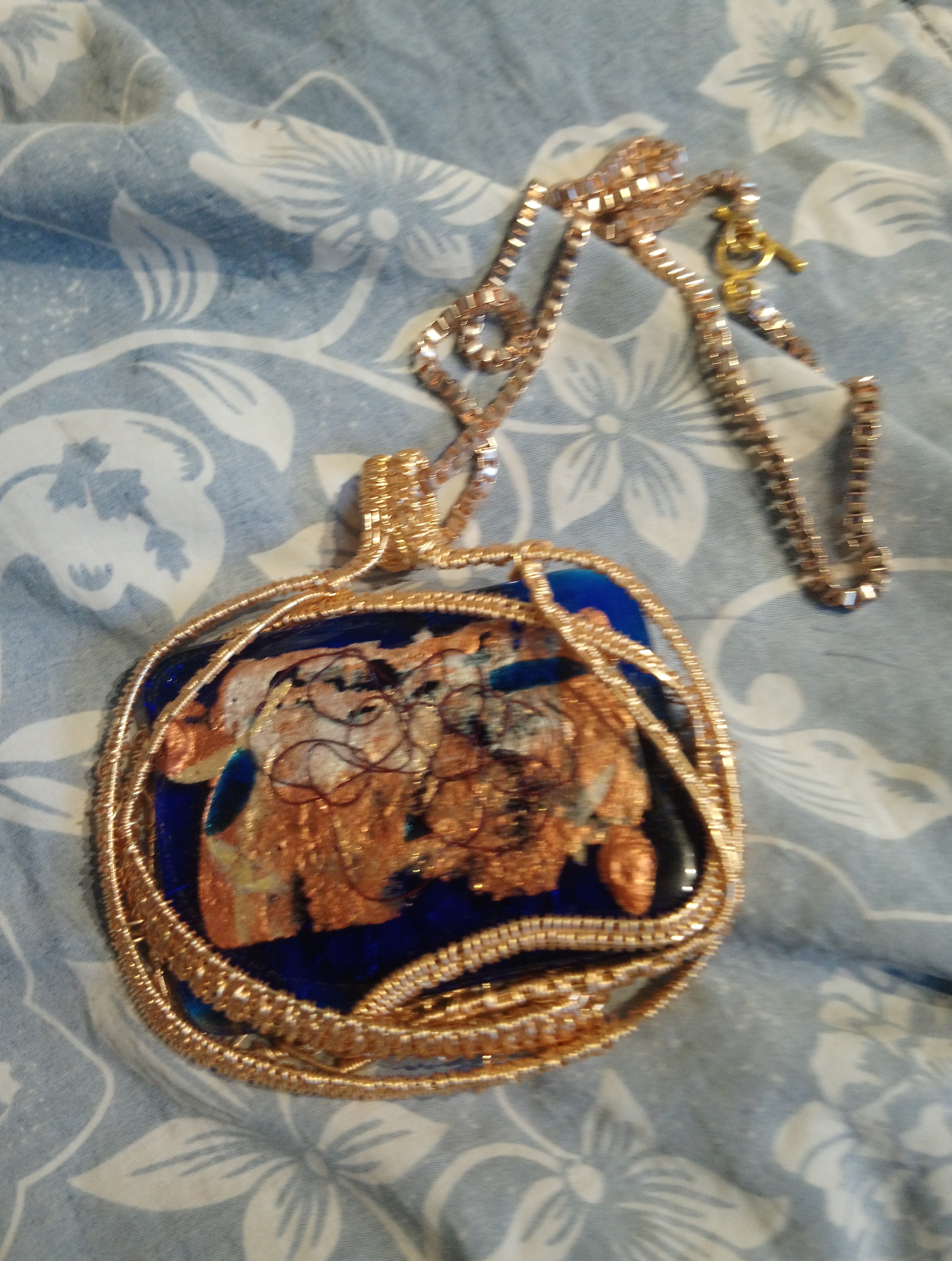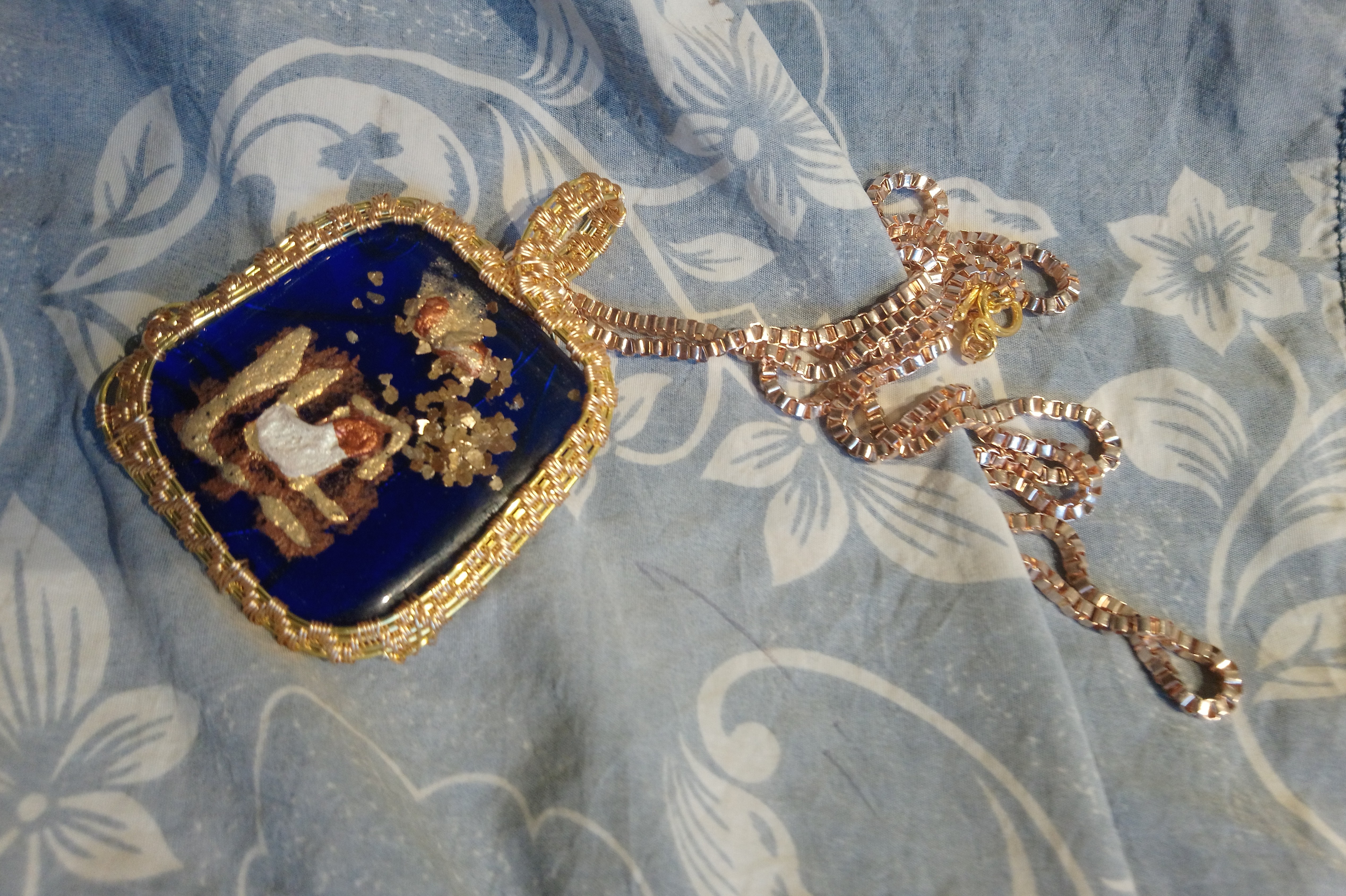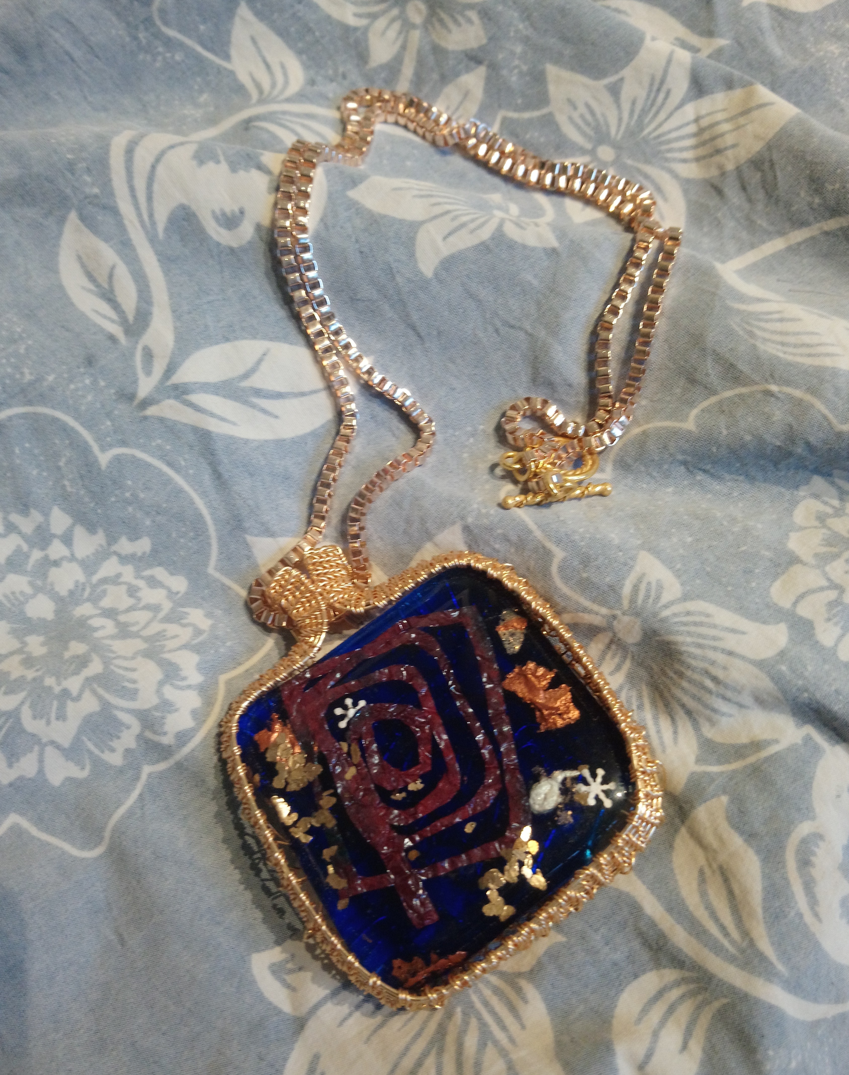I’m pleased to say one of my necklaces, made of dichroic fused glass has gone to a good home. Fused glass is a way of heating and melting various colours of glass together to make a unique pendant.