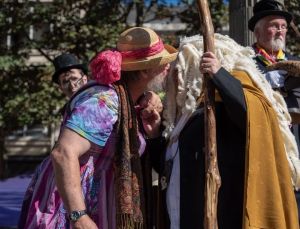 Six years ago I played the Mock Mayor of Newcastle under Lyme and hubby played my mayoress. It was based on the idea of having a fool in charge for a day. Like the idea of the lord of misrule. We had fun playing with the idea of being able to order pies for everyone, or ale and cakes. The crowd would have been let in the local pubs for free. The point was that ordinary people were given the power that they normally lacked for a short period of time. Hubby loved the day. He always enjoyed acting. His great booming voice grabbed the attention, and he could be heard above the crowd. The photographer took a picture of us kissing, me in a massive white wig and staff and cloak and him in a straw hat and a psychedelic tee shirt and one of my dresses. We had 43 years together. This shows our love.