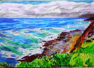 Tuesdays #bandofsketchers prompt was Overlooking. This is an imagined landscape in felt pens. Being in Stoke with a shaking arm means I don’t get to travel much. I want to go to the sea again, and being in an apartment overlooking an ocean view would be a good thing to do.