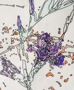 I asked about ideas and my friend sent me this photo of an abstracted idea of Robin Hoods Bay in Yorkshire. It features stone block walls, terracotta tiles, blue sea and sky and a few seagulls. It’s only about 4 inches square on a little canvas. I used bright colours and strong lines to make it more graphic. There are strong outlines so it could almost be a jigsaw. It’s hard to find a balance between abstraction and realism. I stylised the smoke and the sparkles on the sea. The windows seem to float above the surface of the stone, and I’ve used white highlights to hold it together. I think it was a success.