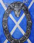 A stag and thistles against a Scottish Saltire. The Penkhull Panto is not having scenery this year except for some smaller A2 panels that I painted a few years ago of various scenes from around the world. I offered to paint something representing Scotland and found various images of Scottish jewellery depicting Stags and Thistles in a semi celtic design. This is my interpretation of the idea. The blue and white of the saltire is a good background to the design. I used two A1 boards glued together for strength (£10) and it is painted in acrylics with some silver metallic pen highlights. I hope they like it.