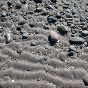 The rocks on this part of the coast are dark and craggy. The water makes them darker, with a slight glint to them. They form layers that slope down into the water and there are plenty of rock pools with barnacles and limpets. There might be small crabs lurking under seaweed in them. Between the rocks the sand is sandy coloured (goldish grey). With flat flakes of rock and stones and pebbles in discreet lines rolled into place by the tides. There are also strands of seaweed left at high tide where sand flies and sand hoppers dwell.