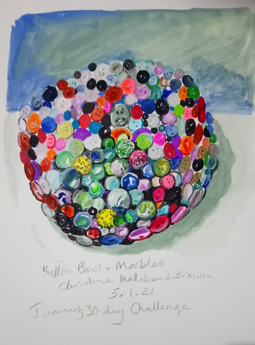 On catch up for #30daysketchbookchallenge, the first challenge was buttons.. This took an hour. For day 1, buttons….and a few marbles in this button bowl…