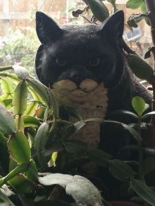 A metal (cast iron) cold painted black and white cat on my windowsill in the kitchen. I have two. They both peep out through the Christmas cactuses. I don’t know why it’s there, it just is. It stares back at me, he’s quite startling in the right light. I’m seeing things better these days.