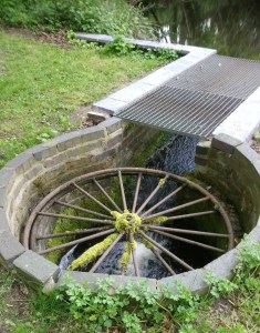 Overflow to a lake or pond. I was stuck by how it was constructed with something that looked like a cartwheel to stop people or things falling in? A bit flimsy. Perhaps it needs a grating or lid on top. Still the moss on the spokes was very natural. The water must be quite clean x