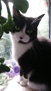 Foreshortening does things like making my cats head look large and her paws small. It’s because the main focus of the photo is her head and everything else is further away from the lens including the paperweights, which are actually almost as big as her head. They are all in focus because of the depth of field. (the distance from the lens that stays in focus when you take a picture). The photo was taken on my mobile phone. If I had taken a picture at about the middle of her body I think everything would have been more in proportion. You can use the position of your camera phone to get interesting effects.